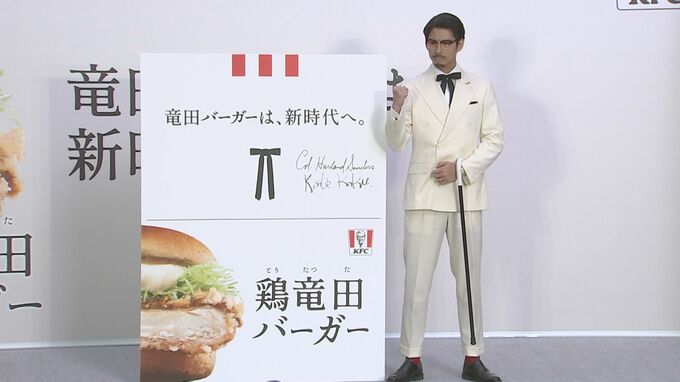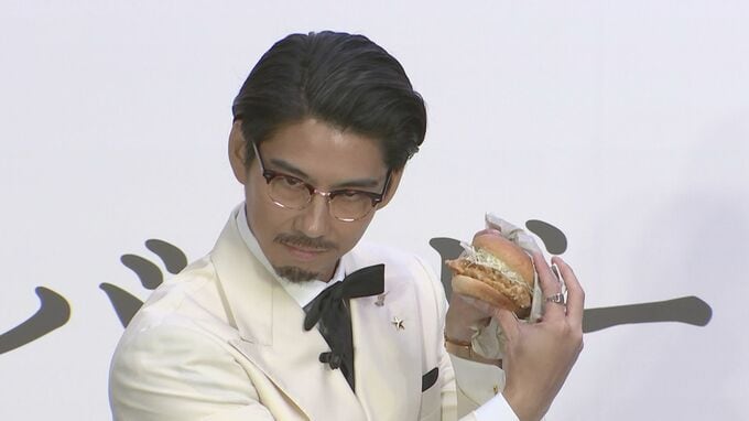 賀来さんは、新作ハンバーガーをゆっくり噛みしめながら試食。“鶏もものジューシーさがある。並みじゃないです。8年の重みがあります。衣のザクザク感じ、噛めば噛むほどのジューシーさと、でも和の雰囲気、ケンタッキーらしさもまざって、本当に新しいケンタッキーならではの竜田バーガーになったんじゃないでしょうか”と、新商品をしっかりピーアールする〝和製カーネル・サンダース〟賀来さんでした。
