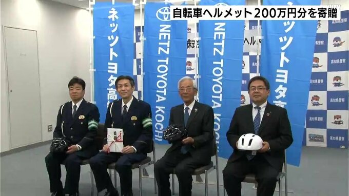 自転車のヘルメット着用率向上につなげようと、高知市の自動車販売会社が県警に200万円分のヘルメットを寄贈しました。ヘルメットを寄贈したのは、「ネッツトヨタ高知」です。佐藤社長が県内のヘルメット着用率の…