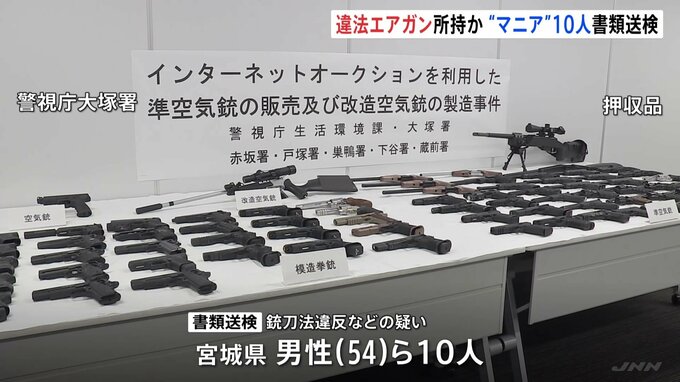 殺傷能力のある違法なエアガンなどあわせて191丁を所持していたなどとして、警視庁はネットオークションでエアガンを売買していた“拳銃マニア”の男性10人を書類送検しました。書類送検されたのは、宮城県の54歳…