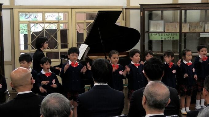 そんな中、本体は磨き上げただけで、内部の部品や弦を交換するなどして再び音を奏でられるようになりました。引き渡し式では、ピアノの伴奏にあわせ幼稚園児たちが歌を披露しました。