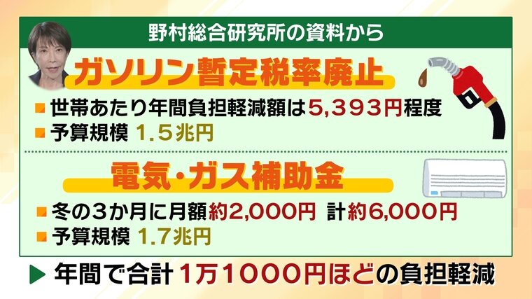 物価高対策・経済政策の中身として見えてきたのが、▼ガソリン暫定税率廃止、▼電気・ガス補助金、▼重点支援地方交付金。この3つについて、野村総合研究所の資料をもとに見ていきます。