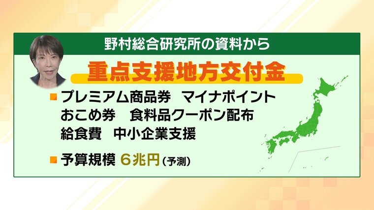 続いて3つ目の重点支援地方交付金。プレミアム商品券・マイナポイント・おこめ券などの支援を想定していて、各自治体で支援内容を決めて使えるものとなっています。予算規模は6兆円と予測されています。
