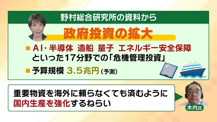 高市総理「政府投資の拡大」を進めていて、AI・半導体・造船・量子・エネルギー安全保障などの17分野での「危機管理投資」を打ち出しています。野村総合研究所の資料によると、予算規模は3.5兆円の予測です。木内氏は「重要物資を海外に頼らなくても済むように国内生産を強化するねらい」だといいます。