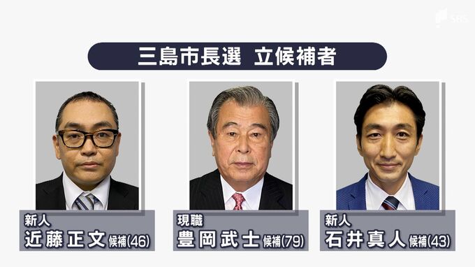 任期満了に伴う静岡県三島市長選挙が12月11日告示され、現職と新人、あわせて3人による選挙戦に突入しました。立候補しているのは届け出順に、▼新人で会社経営の近藤正文氏(46)▼現職で4期目を目指す豊岡武士氏…