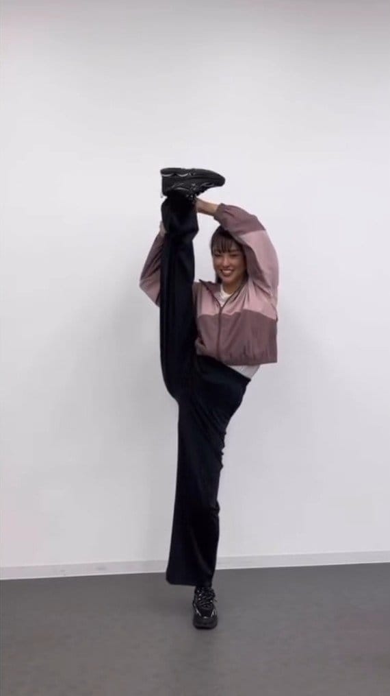 投稿された写真では、片足を真上に高く上げた美しいI字バランスを披露。体幹の強さと柔軟性がなければできないこのポーズを、楽々と決めています。