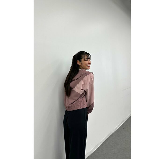 イベント当日は、全身アンダーアーマーの衣装に身を包んだ岡副さん。ピンクと薄紫のカラーリングが特徴的なジャケットに黒いパンツ、スニーカーまで同ブランドでコーディネートしていました。