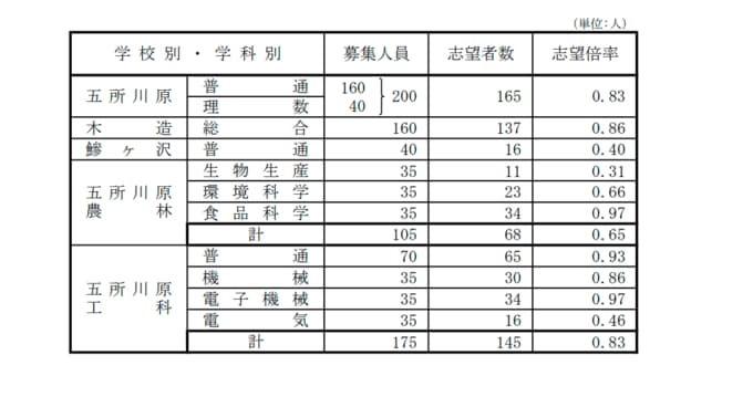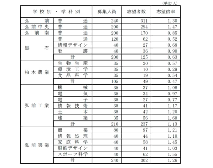 青森県立高校入試2026 志望倍率 青森高校1.32倍、弘前高校1.30倍、八戸高校1.28倍など 最も高いのは青森南1.62倍 全日制0.96倍【全校掲載・学校別倍率一覧】(進路志望状況 第1次調査結果) 3時間前