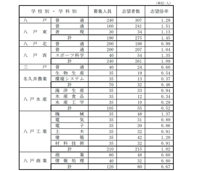 青森県立高校入試2026 志望倍率 青森高校1.32倍、弘前高校1.30倍、八戸高校1.28倍など 最も高いのは青森南1.62倍 全日制0.96倍【全校掲載・学校別倍率一覧】(進路志望状況 第1次調査結果) 青森テレビ 2025年11月18日(火) 17:00 国内