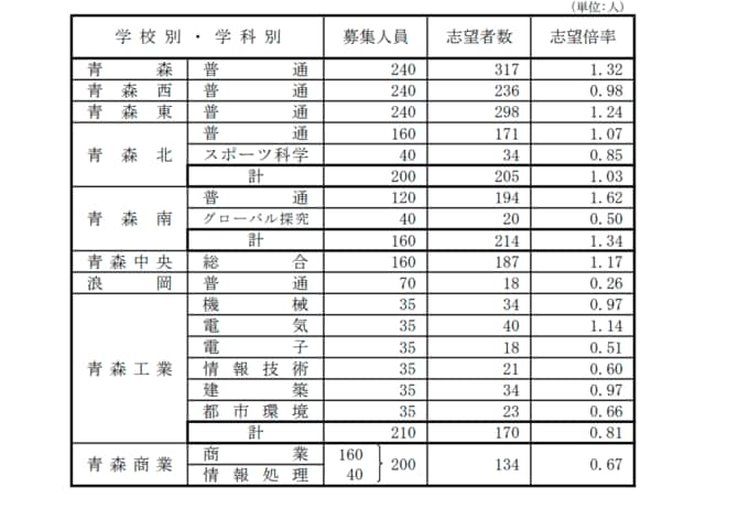 青森県立高校入試2026 志望倍率 青森高校1.32倍、弘前高校1.30倍、八戸高校1.28倍など 最も高いのは青森南1.62倍 全日制0.96倍【全校掲載・学校別倍率一覧】(進路志望状況 第1次調査結果) 5時間前