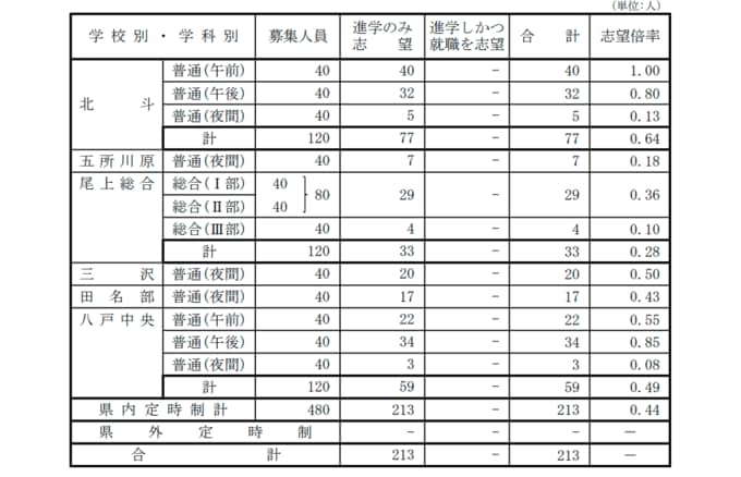 青森県立高校入試2026 志望倍率 青森高校1.32倍、弘前高校1.30倍、八戸高校1.28倍など 最も高いのは青森南1.62倍 全日制0.96倍【全校掲載・学校別倍率一覧】(進路志望状況 第1次調査結果) 6時間前