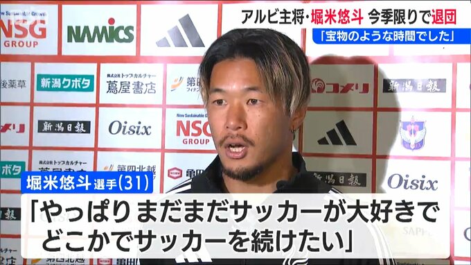 堀米選手は、「ここで引退することを願っていましたが、やっぱりまだまだサッカーが大好きで、どこかでサッカーを続けたいと思っています。サポーターの皆さんと本気で向き合い続けたこの数年の喜怒哀楽は自分にとって一生忘れられない宝物のような時間でした」とコメントしています。