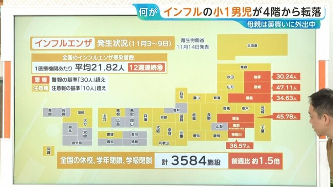 全国のインフルエンザの感染者の数は、1医療機関あたり平均で21.82人。12週連続で増加しています。