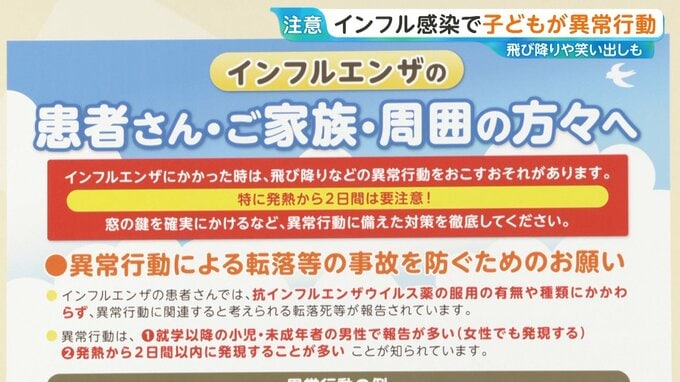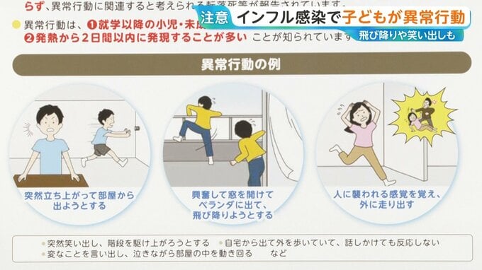 厚生労働省は、インフルエンザによる高熱などが原因で飛び降りなどの異常行動をするケースがあるとして、以下のように注意を呼びかけています。