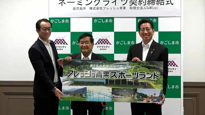鹿児島市の都市公園「鹿児島ふれあいスポーツランド」の愛称が、「フレッシュ青果スポーツランド」に決まり、鹿児島市役所で締結式が開かれました。