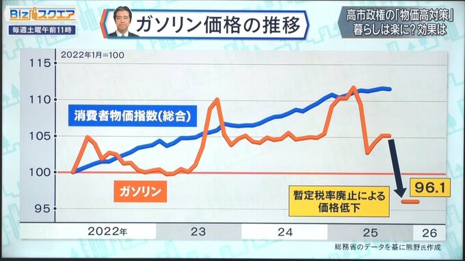 「▼ガソリン価格と▼消費者物価指数(総合)それぞれ2022年の1月から25年9月までの物価上昇率は11.7%だったが、ガソリン価格は5.2%の上昇にとどまっている。暫定税率を廃止すると2022年1月が100に対しガソリン価格は96.1となり、価格支援が過剰になるというのが私の見方。食料品の高騰を置いておいて、ガソリンだけ安くしていいのかと」