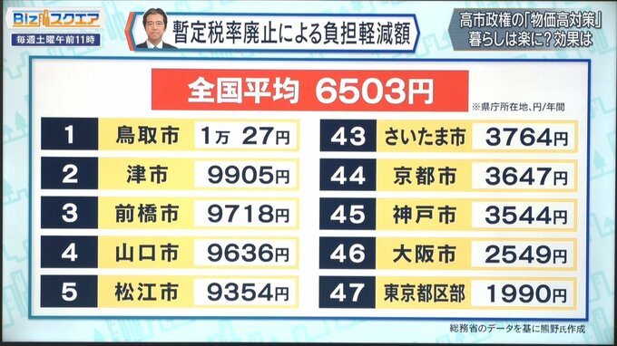 「東京は電車やタクシーに乗るからだと思うが、年間で負担軽減が2000円ぐらいしかなくて、大阪・京都・神戸でも低い。人口比でいうと4割の人口はあまり恩恵を受けずに、むしろ鳥取、三重県、前橋、山口とどちらかというと自民党が強いところには恩恵が増えるみたいな感じ。こんなに偏りがある物価高対策で本当にいいのか」