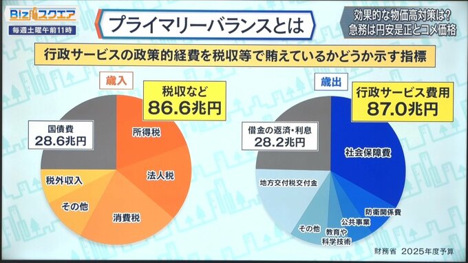 プライマリーバランスとは、社会保障や公共事業をはじめ様々な行政サービスを提供するための政策的経費を、税収等で賄えているかどうかを示す指標。現在は赤字で、「政策的経費を借金で賄っている」状況だ。