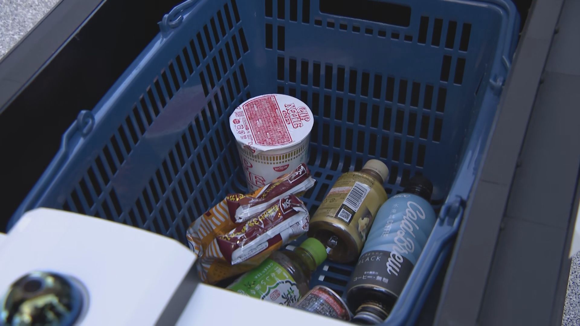 「配送用ロボットの前に立つと…自動で止まるようになっています。安全性もバッチリです」