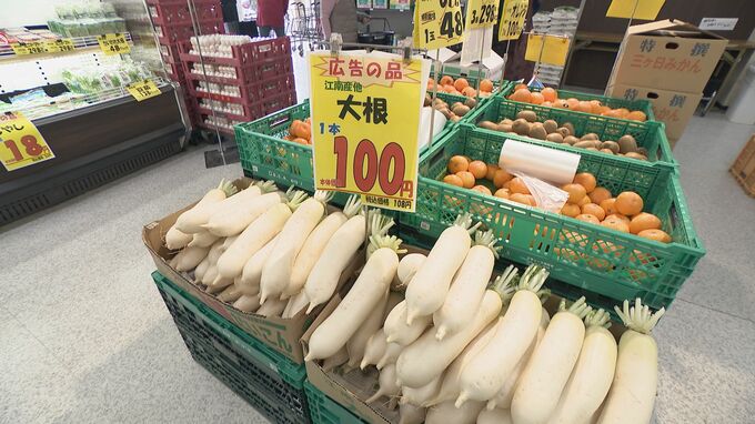 「大根ものすごくおすすめです。大根も白菜同様、ものすごく(量が)豊富で、値段も安くなっています」