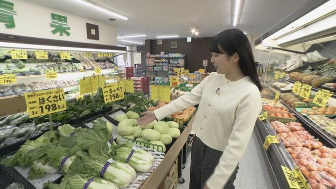 「白菜は今、本当にお買い得です。白菜はことし茨城県産が主だが、ものすごく豊作で値段が安定していて安値に。愛知県産の白菜が入荷し始めていて、さらに値段が下がるのではないかという予測」