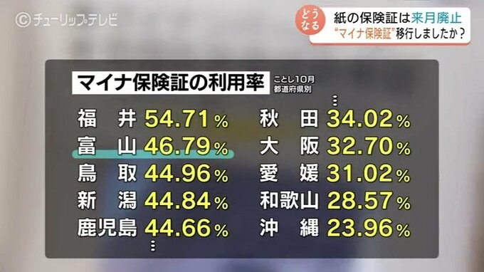 厚生労働省によりますと、ことし10月の県内のマイナ保険証の利用率は46.79%と、福井県に次いで2番目の高さです。