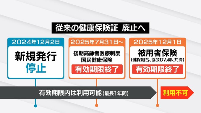 去年12月、政府は従来の保険証の新規発行を停止し、「最長で1年は有効」という経過措置を設けていましたが、これが12月1日に終了します。
