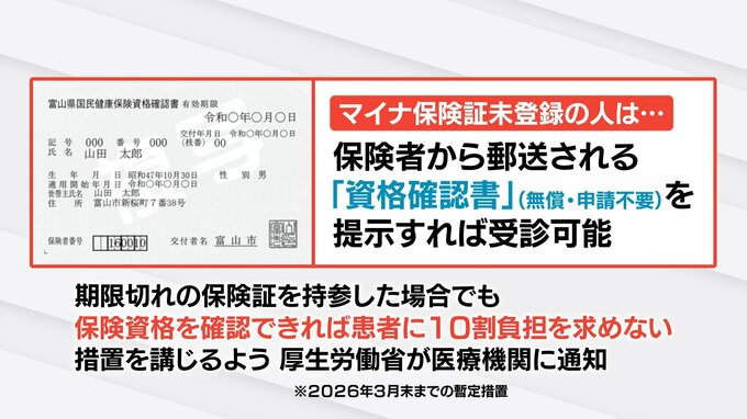 また、厚生労働省は、来年3月末までの暫定措置として、期限切れの保険証を持参した場合でも「保険資格が確認できた場合、10割負担を求めないように」と医療機関などに通知を出しています。