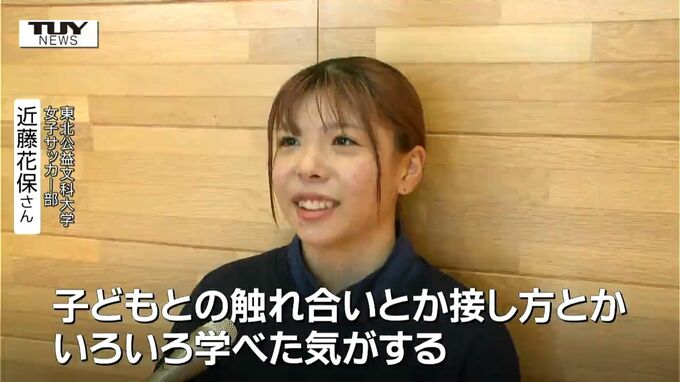 東北公益文科大学 女子サッカー部 近藤花保さん「みんなすばしっこいですね。こっちは疲れたが、みんな笑顔で走ってくれて楽しかった。大学でも教育関係の方で学んでいて教員を目指しているので、子どもとの触れ合いとか接し方とか色々学べた気がする」