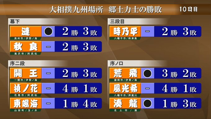 大相撲九州場所10日目郷土力士の取り組み結果です。