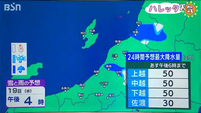 そのため19日の新潟県内は、山沿いでは雪に、平地では上越を中心に大雨になるところがありそうです。