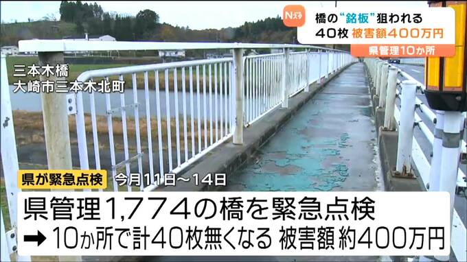 11月10日、宮城県大崎市内の橋で銘板4枚が無くなっているのが見つかりました。盗難被害にあったと見られています。これを受け県が緊急点検したところ、県内10カ所の橋でも合わせて40枚の銘板が無くなっていたことが分かりました。