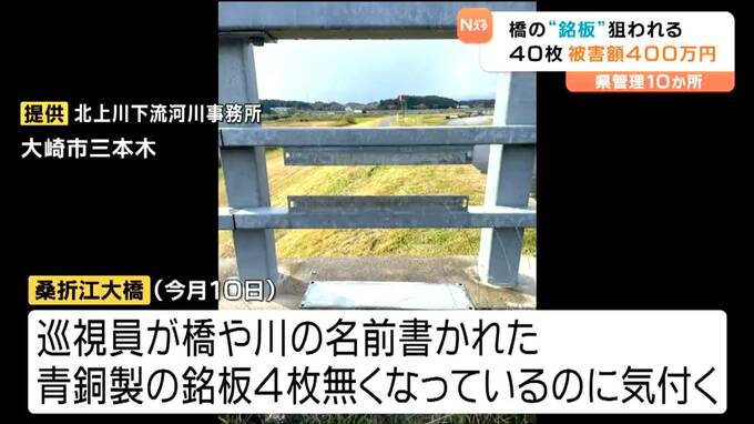 国土交通省北上川下流河川事務所によりますと、11月10日、大崎市三本木の桑折江大橋で、巡視員が橋や川の名前が書かれた青銅製の銘板4枚が無くなっていることに気づきました。ボルトが外され何者かに盗まれたと見られていて被害額はおよそ40万円です。
