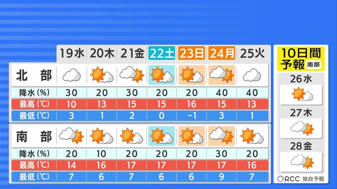 ただ寒気の流れ込みは一時的で、日中の気温はおおむね平年並に戻る見込みです。北部では平年をやや上回る日が多いでしょう。朝晩はしっかり冷え込むため、しっかり着込んでからお休みください。