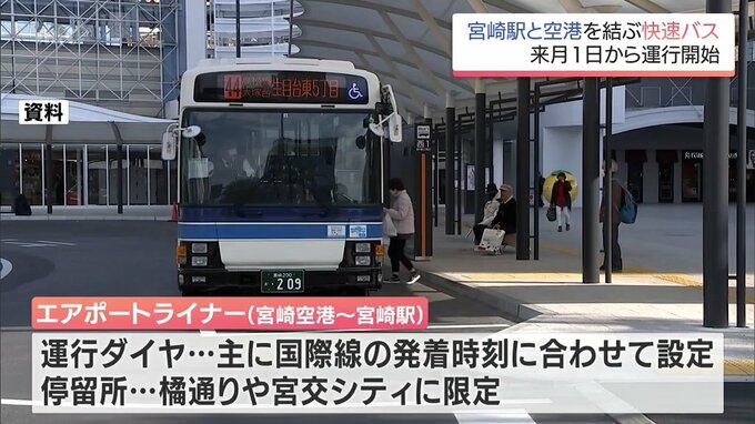 宮崎空港から宮崎駅への交通アクセスがよくなります。宮崎空港を利用する外国人観光客などの交通利便性の向上を図ろうと、宮崎空港と宮崎駅とを結ぶ快速バス「エアポートライナー」が来月1日から運行されます。「…