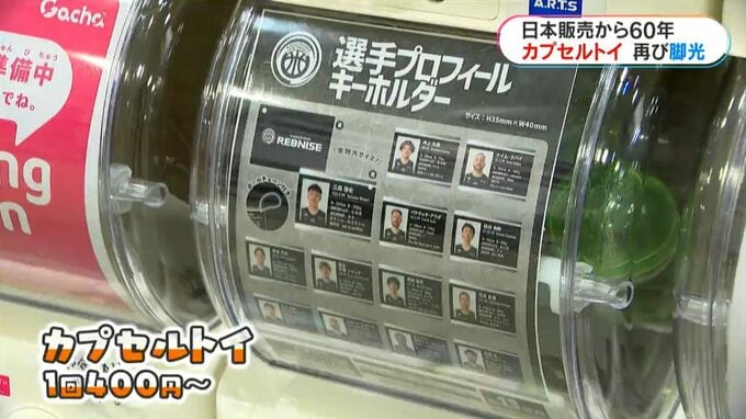 バスケットボールBリーグ・鹿児島レブナイズのグッズ売り場です。ここにも昨シーズンからカプセルトイが登場。選手の顔や背番号入りのキーホルダーなど、年間およそ80種類の限定グッズを取り揃えています。