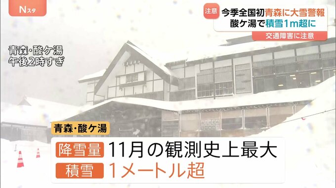 青森県では各地で雪が降り続き、今シーズン全国初となる大雪警報が出されました。酸ケ湯では記録的な大雪で、積雪が1メートルを超えました。青森県内では、今シーズン一番の寒気の影響で雪が降り続き、八甲田山系…