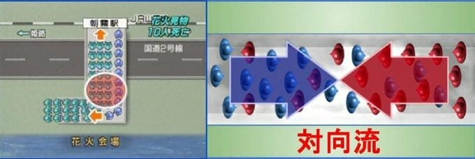 対向流とは互いに向き合う歩行者の集団が交錯すること。進むことも戻ることもできなくなり、逃れることが難しい群衆雪崩がおこります。こうして悲劇は起きてしまいました。