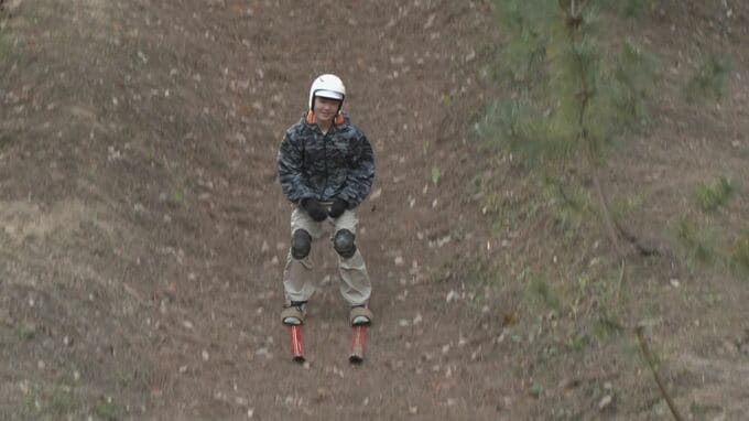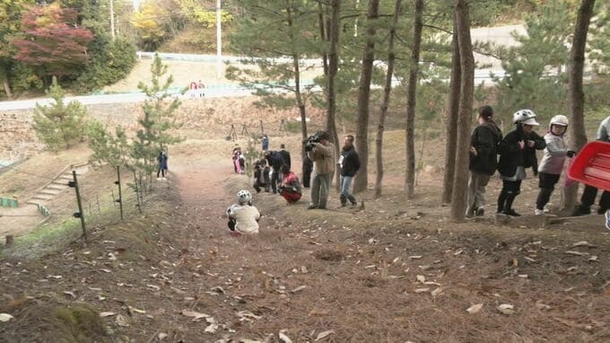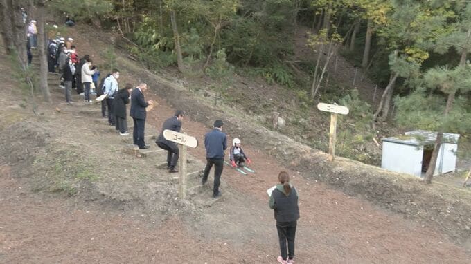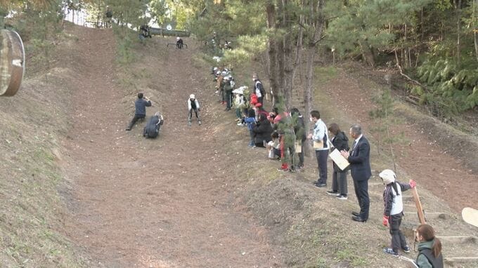 小学生の冬場の体力作りに…落ち葉を敷き詰めたゲレンデを滑る“落ち葉スキー” 聾学校の児童も参加しソリで初滑り 愛知・岡崎市