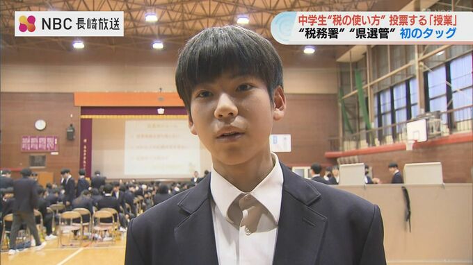 長与中学校の3年生およそ160人が参加した「出前授業」。県の選挙管理委員会と長崎税務署が初めてタッグを組み開きました。