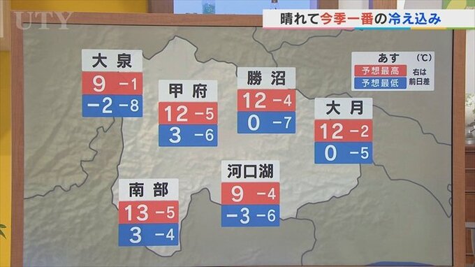 特に北杜市大泉は8℃も低い-2℃、勝沼は7℃低く大月で5℃低く甲府や河口湖も6℃低い予想で今季一番の冷え込みのところが多くなります。