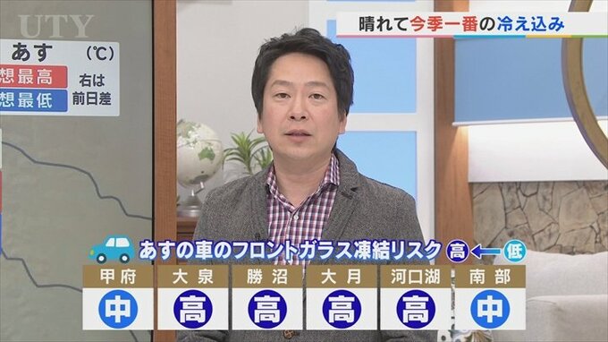 甲府、南部は最低気温が3℃予想ですからそこまでリスクは高くないと思いますが、その他は0℃以下となりますので、あすの朝は凍結する恐れがありますので、皆さん少し早めに起きて準備をするようにしてください。