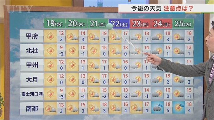 19日は晴れて今季一番の冷え込みに 朝は車のフロントガラスの凍結に注意 米津龍一気象予報士が解説 山梨 テレビ山梨 2025年11月18日(火) 19:34 国内 天気 これを踏まえて週間天気を見ていきますと、天気はこの先大きな崩れはありません。 ただ、金曜日以降は朝は冷えて、昼間は晴れて気温差が大きくなりますので、体調管理に十分な注意が必要です。 <詳しい各地点の天気は動画をご覧ください>