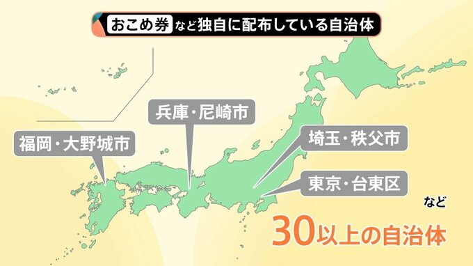 すでに「おこめ券」を独自に配布している自治体は、▼東京・台東区、▼埼玉・秩父市、▼兵庫・尼崎市、▼福岡・大野城市など、30以上あります。