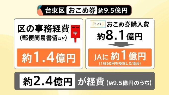 東京・台東区の場合、「おこめ券」に関連する区の補正予算として、約9.5億円が計上されました。そのうち、「おこめ券」を配布するための郵便簡易書留などに使用される、区の事務経費に約1.4億円必要となります。