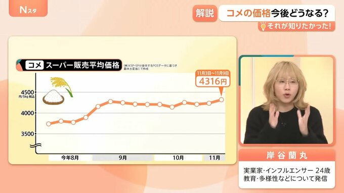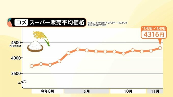 スーパーのコメの販売平均価格は、2025年8月以降から上がっていき、今は4316円となっています。(11月3日~11月9日)