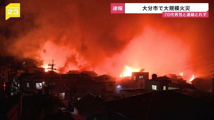大分市佐賀関で午後6時前に「家が燃えている」と通報が入りました。5時間以上が経っても火は消えず、住宅など20棟以上に燃え広がっていて70代の男性と連絡が取れていません。現場には消防車15台以上が出動していま…