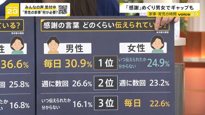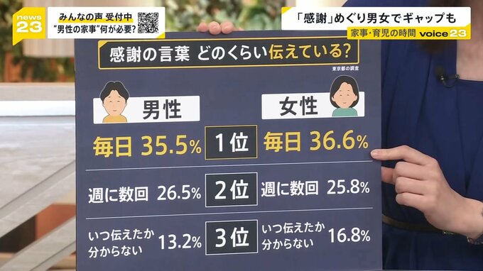 今回の調査で男女の差が顕著だったのが、家事・育児をめぐる感謝の言葉の頻度についてです。