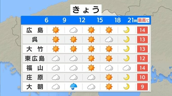 このあとも、寒気の影響を受けて、北部中心に昼前まで雨が降る見込みです。南部では、次第に日差しも届くでしょう。日中の気温は、広島・福山で14℃、呉13℃、庄原10℃の予想です。風が冷たいので、日中も防寒対策をしながらお過ごしください。