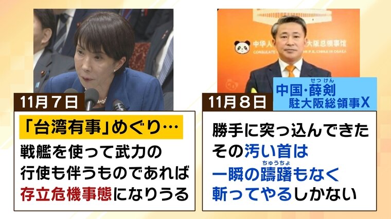 事態打開のチャンスかと言われていた今週末のG20についても中国側は「高市総理と会う予定はない」としていて、現時点では関係改善の兆しはなさそうです。