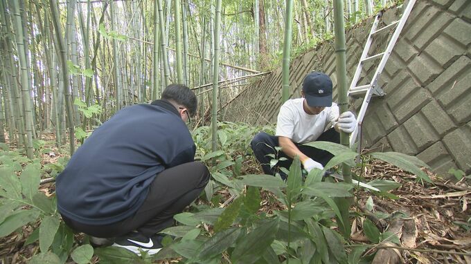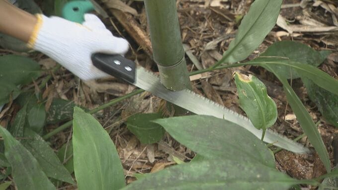 島崎会長が竹の伐採チームに「細くてまっすぐで、長さあるやつを切って」と指示します。太い竹は間垣には適しません。